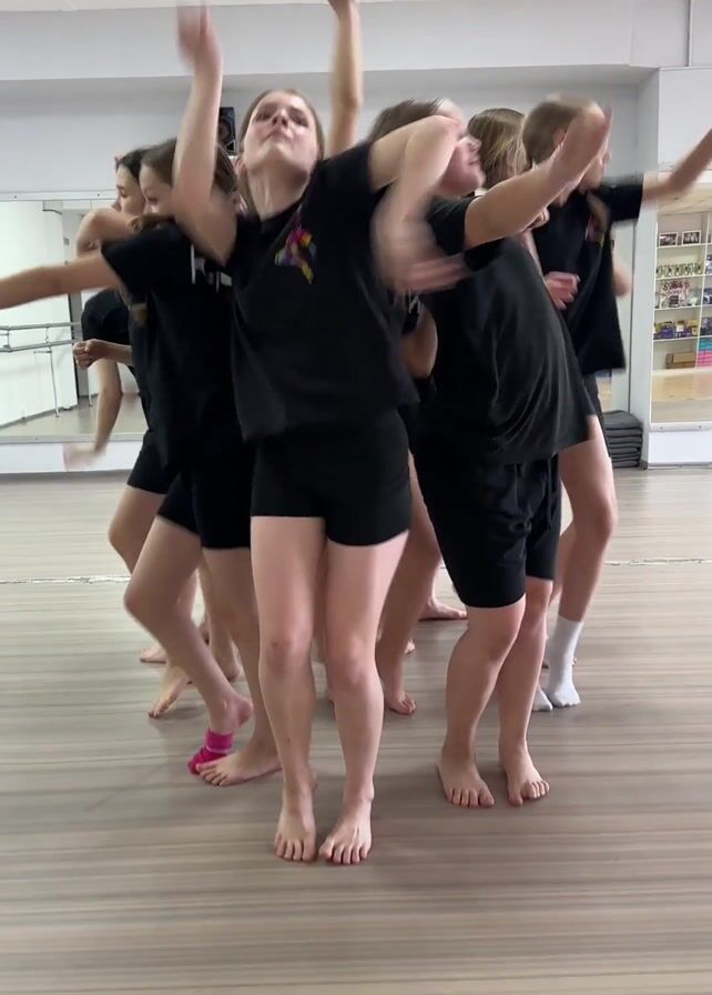 In a brightly lit dance studio with wooden floors and mirrored walls, a group of approximately ten young girls are rehearsing a dance routine. They are dressed uniformly in black t-shirts and black shorts. The girls are barefoot, except for one girl who has a pink sock on one foot. They are arranged in a close circle, performing synchronized movements involving arm extensions, torso bending, and leg lifting. The dance appears dynamic and energetic. An audio cue of “chik chik chik” can be heard, possibly from a dance instructor to guide the movement. A speaker can be seen in the background.