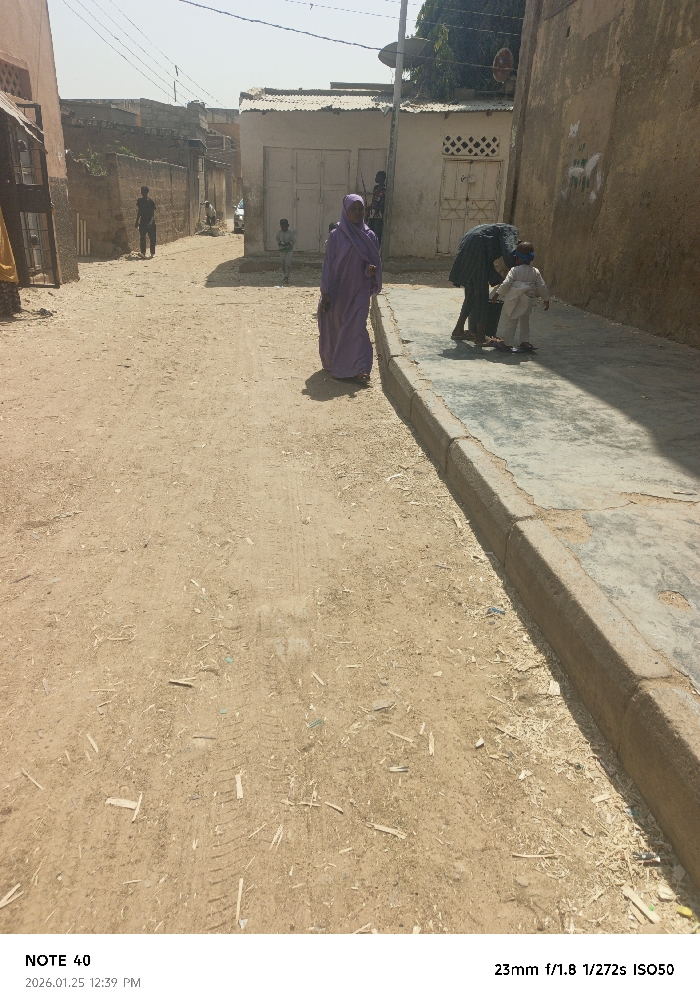 The image depicts a daytime street scene in Tudun Wazurchi, Nigeria. The foreground and midground are dominated by a dry, light brown dirt road with visible tire tracks and scattered wood chips and debris. A raised concrete sidewalk with a pronounced curb runs along the right side of the frame, showing signs of wear and minor cracking. Multiple individuals are present. In the midground, right of center, a person wearing a long, flowing purple robe and head covering walks from left to right, casting a shadow to their right. Behind and to the right of this person, closer to the sidewalk curb, another individual in dark clothing is bent over, facing right, appearing to interact with a small child. The child, dressed in light-colored clothing and wearing blue goggles or eye protection, stands upright, facing right. Further down the dirt road on the left, a person in dark clothing walks away from the camera. Another small child, dressed in a light green top and white pants, is visible further down the road near a white building. Buildings line both sides of the street. On the left, there is a light-colored building with an apparent open doorway or recessed entrance, followed by a low wall and more residential structures. On the right, a tall, weathered ochre-colored wall extends into the background, casting a prominent shadow across the sidewalk. In the midground, a white building with a corrugated metal roof and two large, light-colored double doors is visible, with another light-colored building featuring a patterned ventilation block and a door to its right. Electrical wires are strung across the street, and a satellite dish is mounted on a pole near the white building. The sky is clear and bright, indicating direct sunlight at what the embedded metadata identifies as 12:39 PM.