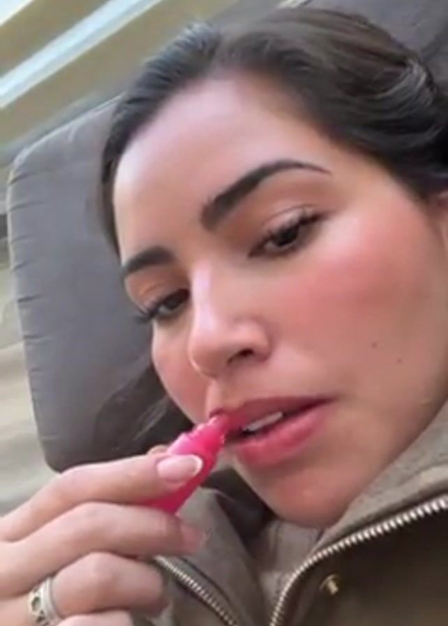 A woman lies on a padded surface, possibly a sofa or bed, while applying lip gloss. The woman has dark hair and wears a brown jacket. She holds a pink tube of lip gloss in her right hand and applies it to her lips. After applying the gloss, she glances at the camera with a slight smile. The background includes a window with blinds.