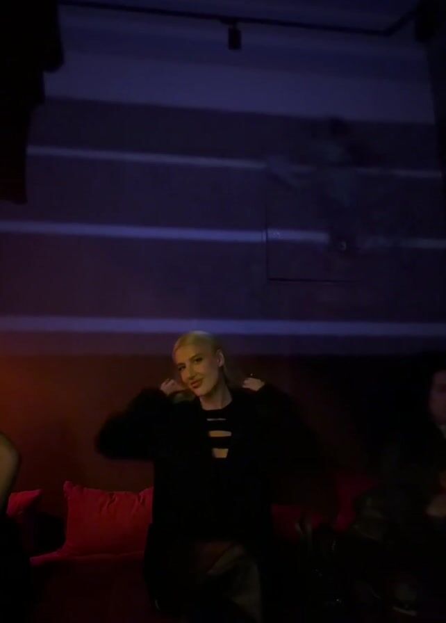 blonde woman in a black outfit sitting on a red couch in a dimly lit room. She's smiling and looking at the camera. There are other people on the couch as well, though they are mostly out of focus. In the background, there is a projection on the wall. The room has a dark, club-like atmosphere. There's a glass with liquid on a small table next to the woman.