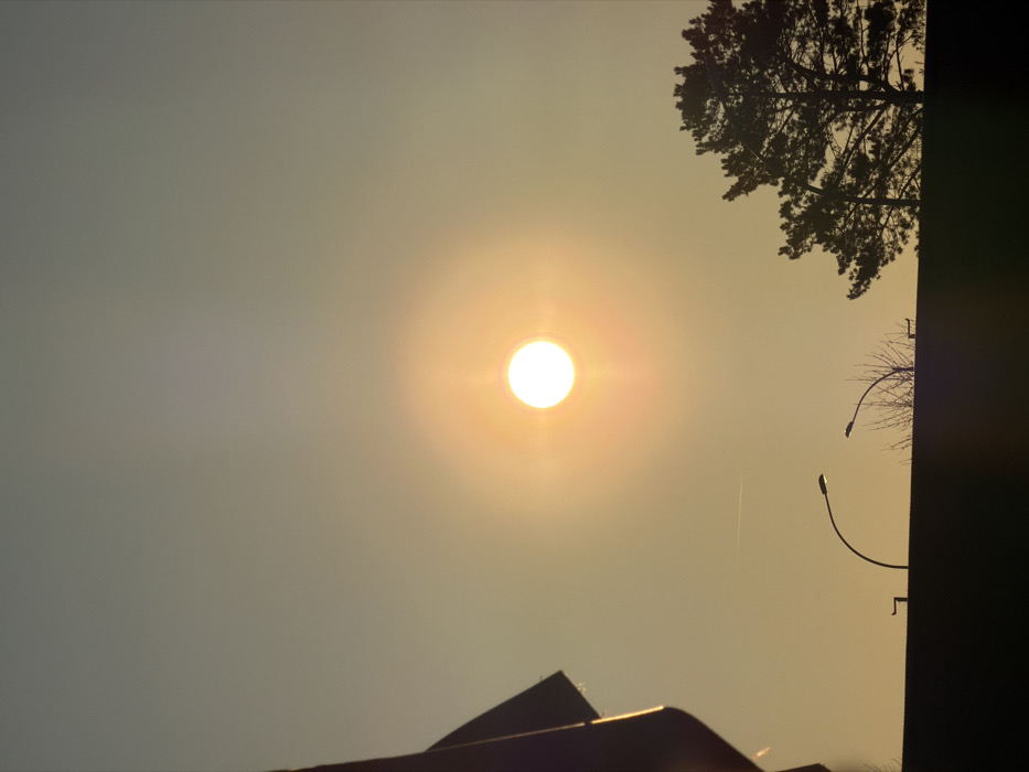 This image, captured in Leudelange, Luxembourg, displays a landscape scene at either sunrise or sunset, characterized by strong backlighting. The dominant feature is a bright, circular white sun, surrounded by a prominent orange-yellow halo and light rays, positioned slightly above the vertical center against a clear, light yellowish-grey sky. A faint, linear contrail is visible horizontally in the sky above the left-center horizon. The lower portion of the frame features a dark, indistinct silhouette of what appears to be ground level or a low structure. Against the illuminated horizon, several objects are discernible in silhouette: * On the far left, a partial, dark, angular shape, possibly a structural element or flag, extends into the frame. * Two modern, curved streetlights are centrally positioned, their heads directed inward. * To the right of the streetlights, a sparse, bare tree (likely deciduous) is visible. * On the far right, a dense conifer tree forms a distinct silhouette. * Between the streetlights and the bare tree, and to the right of the bare tree, faint, low-profile rectangular shapes (possibly benches or architectural features) are present on the horizon line. No human figures or explicit actions are observed within the frame. The environment combines natural elements (trees, sky) with man-made infrastructure (streetlights, potential buildings).