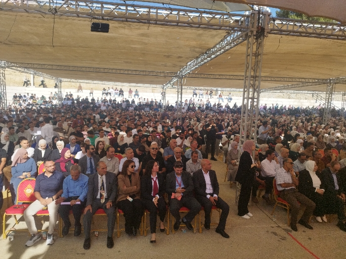 The image captures a large outdoor gathering in Al-Khalil, Palestinian Territory