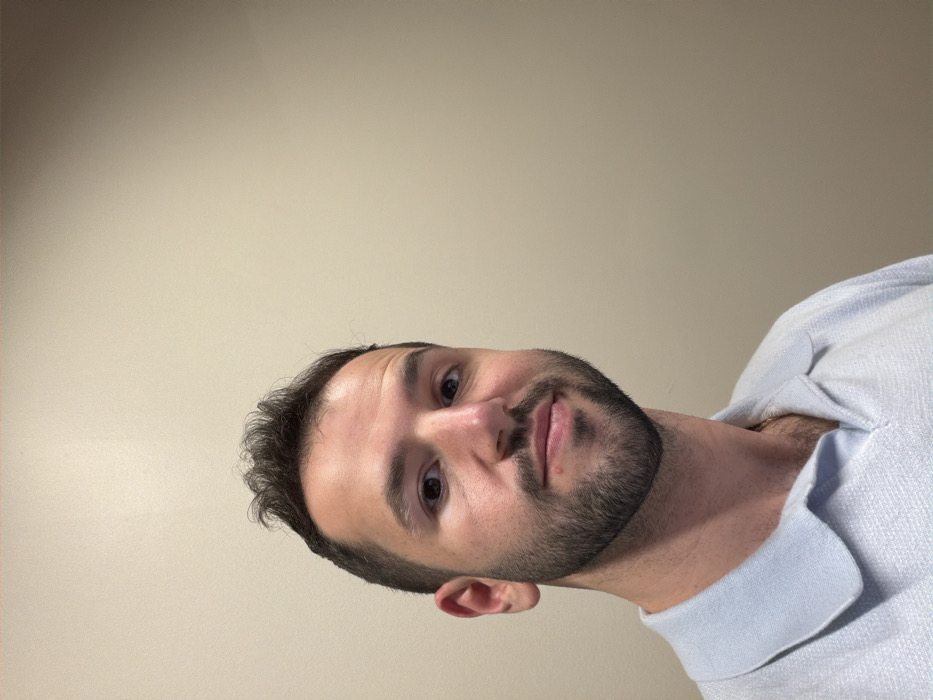 A light-skinned man with dark hair and a beard poses for a close-up shot. He is wearing a light blue collared shirt. The background is a solid, light beige color. The man's face is slightly tilted, and he is looking directly at the camera with a subtle smile. The lighting is soft and even, casting a slight shadow on the upper left corner of the frame.