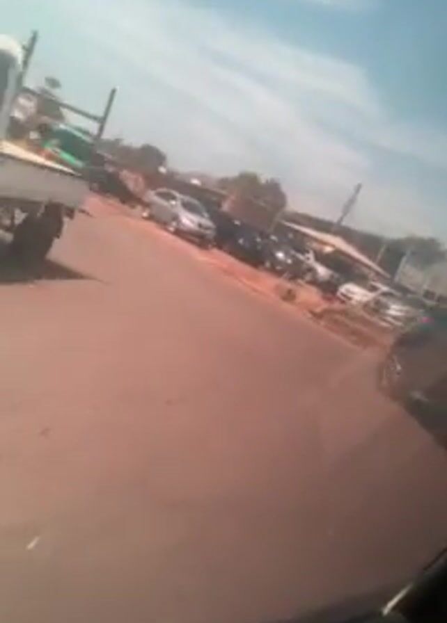 A camera moves from inside a vehicle driving on a road with other cars, scooters, and an auto rickshaw. Buildings are visible on the roadside. The sky is blue with scattered clouds. The sun appears bright.