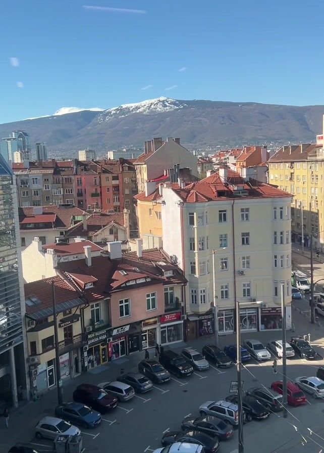 high-angle daytime view of a city streetscape. Cars are parked in a parking lot, and other cars and trams are moving along the streets. Pedestrians can be seen crossing the streets. Buildings line both sides of the street, with a mountain range in the distance. The sky is clear and blue.