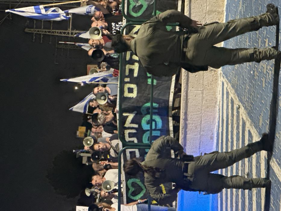 This nighttime image depicts an outdoor scene in an unspecified city in Israel. In the immediate foreground, two individuals, presumably security personnel, stand with their backs to the viewer, facing a crowd. Both wear olive-green tactical uniforms with utility belts and boots. The individual on the left has dark hair in a ponytail and a yellow band on their left arm. The individual on the right appears male. They stand on a surface featuring blue and white striped markings. A low, light-colored concrete barrier, topped with green metal railings, separates the security personnel from the gathering crowd. Behind this barrier, a dark banner with light-colored Hebrew text and a green heart symbol on the left side is displayed horizontally. In the background, a dense crowd of people, composed of adults of various ages and genders, is visible. Many individuals in the crowd are holding white megaphones, and numerous Israeli flags are held aloft. The scene is illuminated by artificial light, and the sky is dark, indicating night. Distant structures, including a tall metal utility tower, are discernible against the dark horizon on the right.