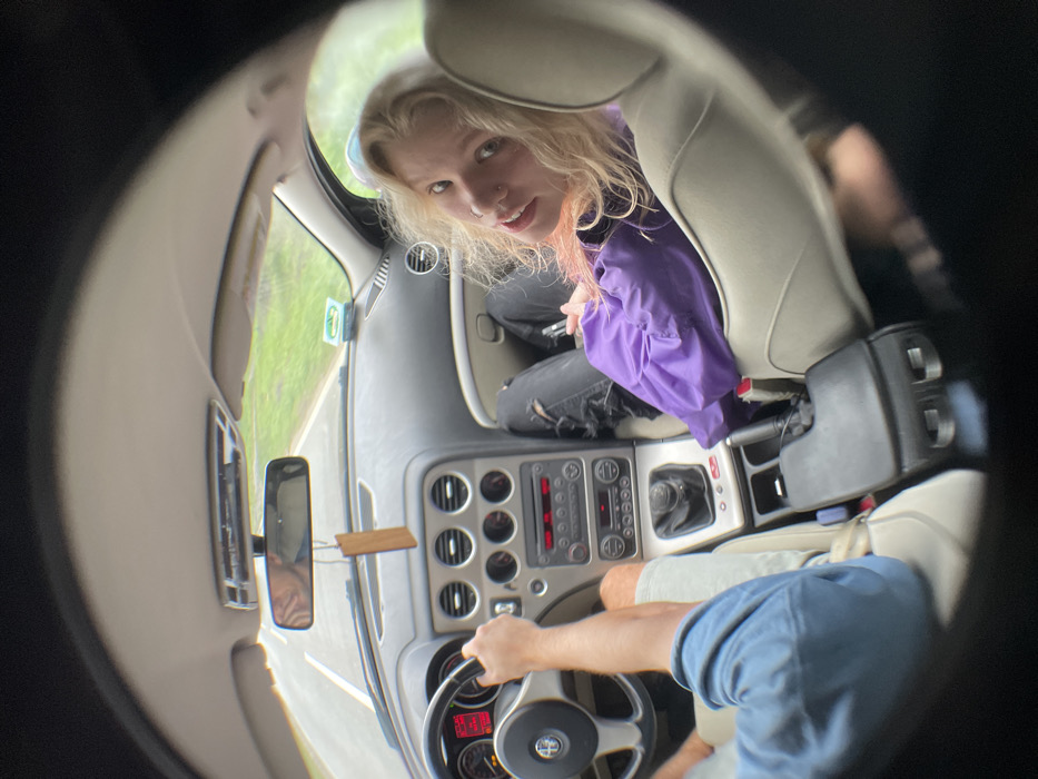 An interior vehicle photograph, captured with a fisheye lens, depicts a scene within a car in motion in Podlastva (Poljice), Montenegro. The perspective is from the rear passenger area, looking towards the front. Two individuals are present: a male driver, visible from the upper thighs to the right forearm, operating the steering wheel with both hands. He wears a light blue shirt and light-colored shorts. A female passenger occupies the front seat, facing the camera with her body angled slightly. She has long, wavy blonde hair, a fair complexion, and a nose piercing on her right nostril. She is wearing a purple jacket and ripped black jeans; her left foot is propped on the dashboard. The vehicle's interior features a gray/black dashboard with four prominent circular silver-rimmed air vents in the center. Below these are the car's infotainment system with red digital readouts and climate controls. A manual gear stick with a black knob is situated between the driver and passenger seats. A black center armrest/storage compartment with an exposed cable is also visible. The steering wheel, bearing an Alfa Romeo emblem, is black with silver accents. A rectangular wooden air freshener hangs from the rearview mirror, which partially reflects the driver and the road. The seats are light beige. Outside the car, an asphalt road with a dashed white center line and a solid white shoulder line is visible through the windshield, flanked by green grass and vegetation. The overall lighting suggests daylight.