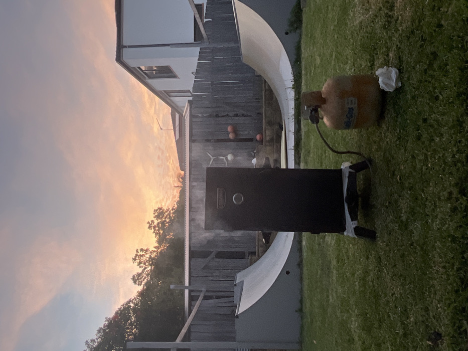 This image depicts a residential backyard in Coalcliff, Australia, at twilight. In the foreground, a black, rectangular Masterbuilt propane smoker stands on a black base, emitting visible white smoke from its top vent. It is connected by a hose to a rust-orange "Kwik-Gas" propane cylinder resting on the green grass. A crumpled piece of white paper lies near the gas cylinder. The midground features a weathered grey wooden fence running horizontally. Flanking the smoker, two grey-and-white quarter-pipe skate ramps are positioned against the fence, one to the left and one to the right. Behind the fence, a tiered area with steps is visible, upon which several red/orange spherical objects (possibly balls) and a white, multi-pronged, antler-like decoration are present. The background shows dark green tree foliage on the left and center. To the right, a two-story, light-colored house with a dark roof and solar panels is visible. The sky above is characterized by an array of soft orange, pink, and light blue hues with scattered cloud formations, indicative of either sunset or sunrise. No individuals are present in the scene.
