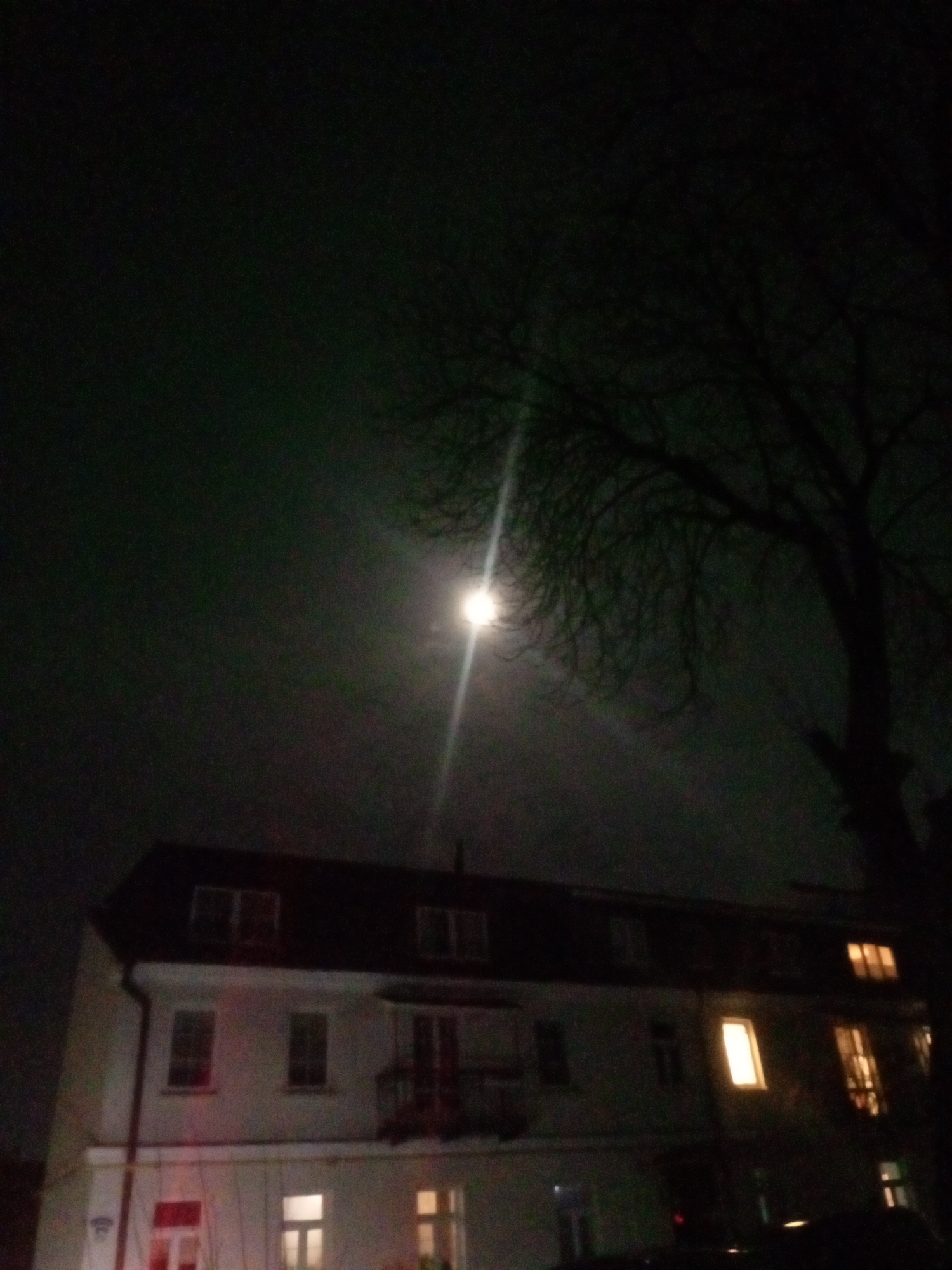 nighttime scene of a residential building in Hrodna, Belarus. The building is white with a dark roof and multiple windows, some of which are illuminated. A bare tree is silhouetted against the night sky to the right of the building. A light source, possibly a streetlamp or the moon, is visible in the upper center of the image, casting a vertical ray of light. The sky appears dark and cloudy. No people are visible in the image.