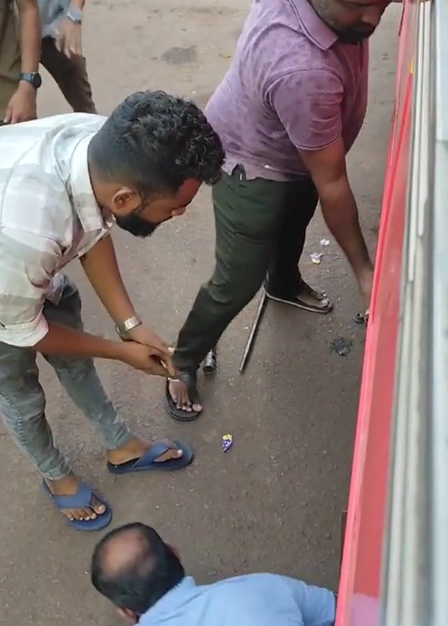 three men changing a tire on a red vehicle, likely a bus or truck. One man, wearing a light blue shirt, is lying on the ground near the tire. Another man, wearing a white and grey checkered shirt, is kneeling, helping to maneuver the tire. The third man, wearing a purple shirt, is also assisting with the tire. The tire is a large, used-looking tire with visible tread. A lug wrench is lying on the ground. Other people can be seen in the background, including one man wearing a khaki shirt. The setting appears to be outdoors, on an asphalt or concrete surface.