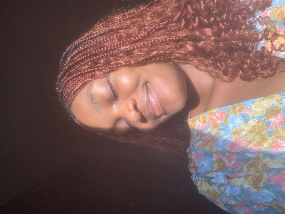 A close-up, chest-up portrait features an individual identified as female, with dark skin, facing slightly left of center, eyes closed, and a slight smile