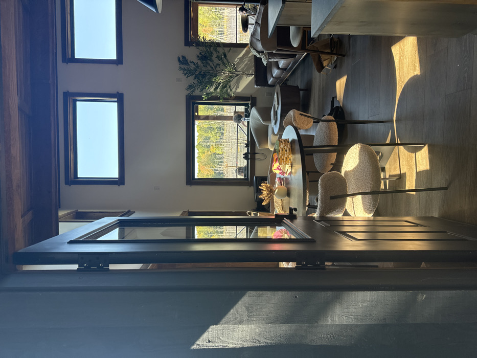 The image displays an interior view of a modern living and dining space located in Otego, United States, captured from a doorway on the left. The room features high white walls, dark wood flooring, and an exposed dark wood beam ceiling. In the mid-ground, a round, dark-surfaced dining table is visible, surrounded by three light-beige, textured chairs with dark metal legs. On the table, a small white vase holds dried foliage, and a multi-colored, possibly woven, bowl contains fruit. A black backpack rests on the floor under one of the chairs. Direct sunlight streams into the room, creating distinct shadows of the chairs on the floor. The background reveals a living area with a dark brown leather sofa and two light-beige armchairs. A small, round coffee table with a ribbed base sits between the sofa and an armchair, holding what appear to be books or magazines. A tall, artificial green plant stands between the sofa and a large window. This window, along with two smaller rectangular windows positioned higher on the wall, overlooks an outdoor scene with deciduous trees displaying autumn foliage in yellows and oranges, alongside numerous vertical bare structures resembling vineyard posts. A pair of black binoculars rests on the windowsill. Two upper windows show a clear blue sky. A dark-colored pendant light fixture is partially visible on the upper right, and a light-toned kitchen island or counter is partially seen on the far right. No individuals are discernible within the scene.