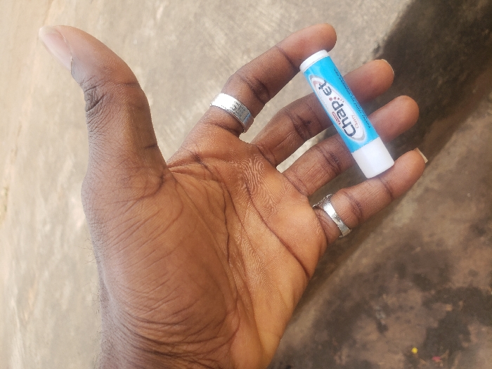 A close-up image depicts a dark-skinned human left hand positioned open, palm facing upwards, displaying an object. The scene is located on an outdoor, light-colored concrete or paved surface in Barnawa, Nigeria. The hand wears two silver-toned rings: one on the left ring finger and another on the left middle finger. Resting horizontally across the palm and fingers is a white and blue tube of "Chap-et Cherry" lip balm. The background consists of the textured ground surface, exhibiting variations in shade from light beige to darker greyish-brown, with minimal out-of-focus debris visible in the lower left quadrant.