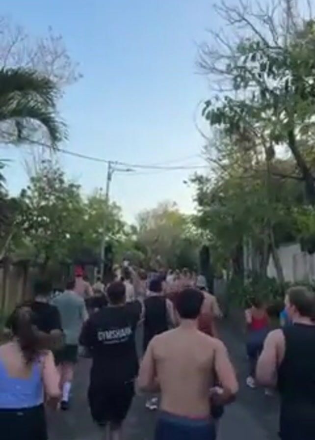 A large group of people are jogging down a street lined with trees and power lines. The video is taken from behind the runners, looking forward. Many of the male runners are shirtless, while others wear t-shirts, including one with the logo "Gymshark." The women in the group are wearing athletic tops. The sky is clear and blue, suggesting it's either early morning or late afternoon. The overall atmosphere appears to be one of community and exercise.