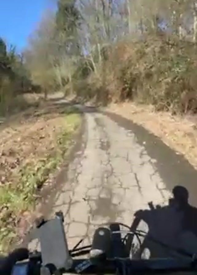 The camera is mounted on the handlebars of a bicycle, pointed along a rough, cracked asphalt road heading uphill