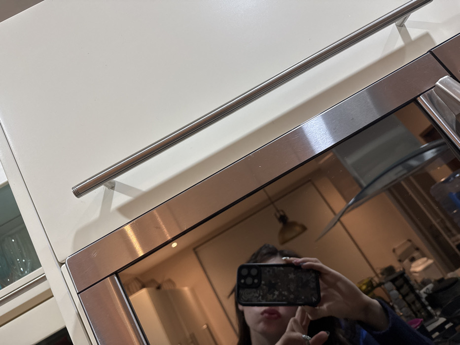 A partial view of a kitchen is captured, focusing on a light-colored cabinet with a metallic handle. Below, a stainless steel oven door reflects the room's interior, including a hanging light fixture, shelves, and the person taking the photo. The photographer's face, partially obscured by a phone with a camouflage patterned case, is visible in the reflection.