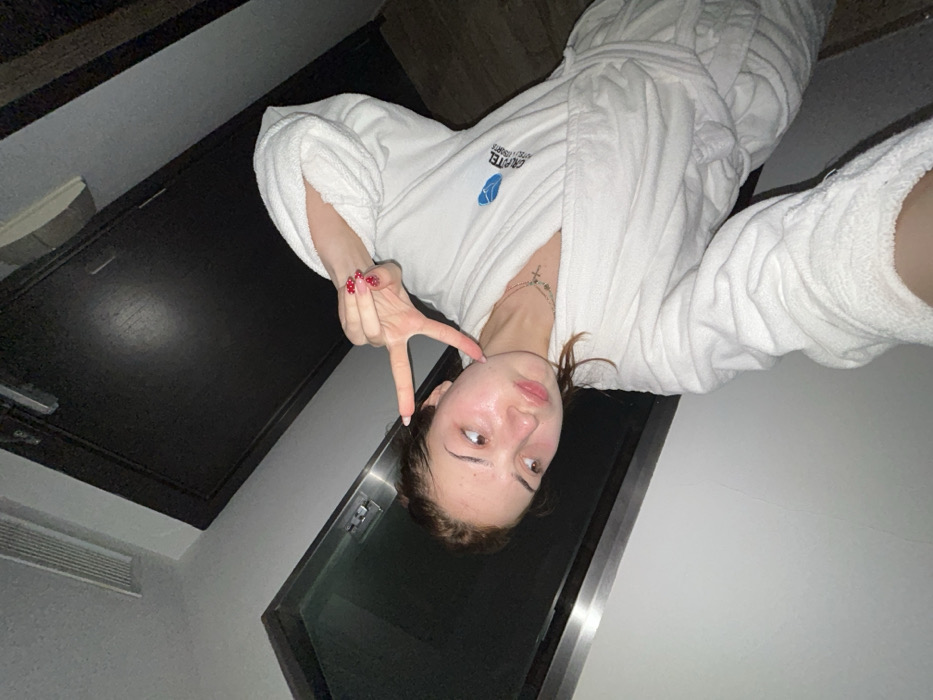 A woman in a white bathrobe poses for a photo, upside down relative to the viewer. She gives a peace sign with her left hand, displaying red patterned nails. She wears a necklace with a cross. The background features a dark door, a wall with an air vent, and a large window. The bathrobe has writing on the left breast. Her skin appears fair and her hair is pulled back.