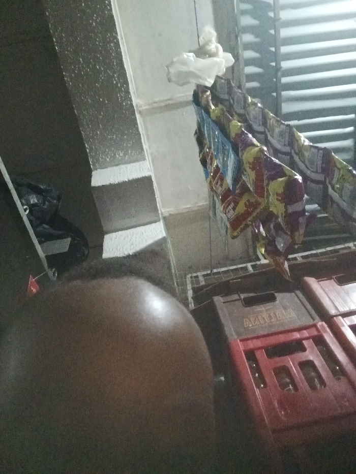 An indoor scene, likely a storage area, features a person's shoulder dominating the foreground. Behind the shoulder, two stacked plastic crates, one red and one brown, are visible. Above them, a string of snack bags hangs, possibly drying or for display. Above the bags, sunlight streams through slatted window blinds. A white cloth is tied around the string. The setting is dimly lit.
