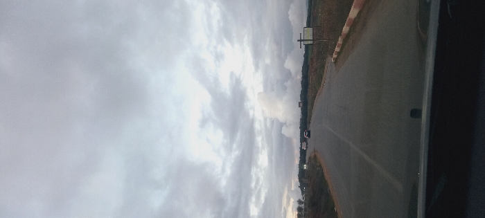 A cloudy sky dominates the view, with dense cloud cover. A gray road runs along the right side of the frame, marked by a white line. A strip of grass and trees separates the road from the sky. A sign is visible near the roadside. The image is shot from within a vehicle, suggested by the interior elements at the right edge.