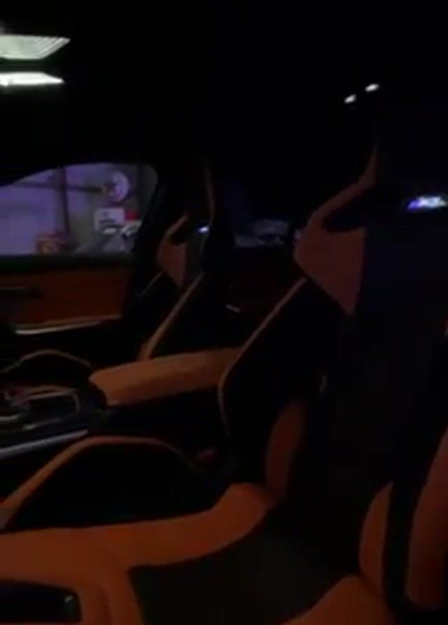 interior of a car, specifically the driver's side. The seats are black with orange accents. The dashboard and door panels are also orange. There is a digital display on the dashboard, and the interior is illuminated with pink and purple ambient lighting. The car appears to be in a garage or similar indoor space with additional lighting visible.