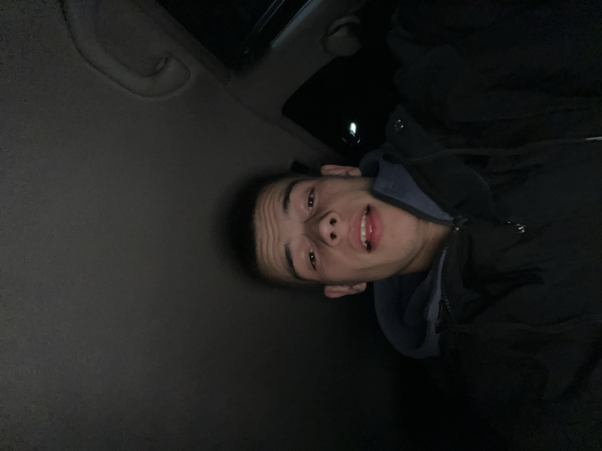 A photograph taken indoors from a low angle shows a young man. The interior appears to be a car based on the ceiling light and handle visible in the top left of the frame. The man is wearing a blue hooded sweatshirt underneath a dark-colored jacket. His expression includes slightly furrowed eyebrows and a small smile, showing his upper teeth. The overall lighting in the scene is dim. The location in the city of Anevo, Bulgaria is not evident from the image.