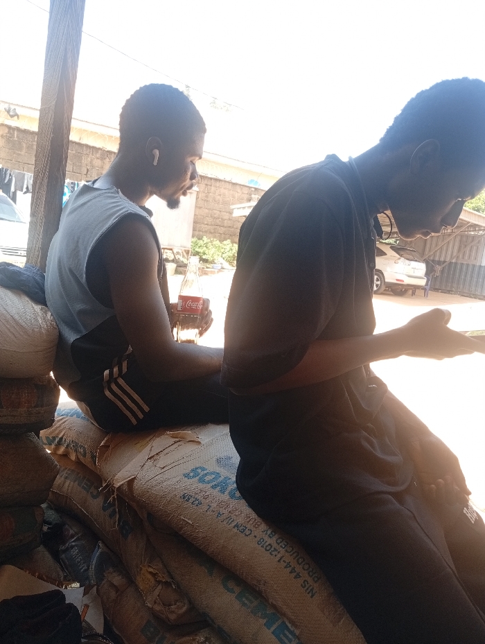 In the city of Jos, Nigeria, two young adult males are seated outdoors on stacked cement sacks, with "SOKOTO CEMENT" and "NIS 444-1:2018 CEM I 42