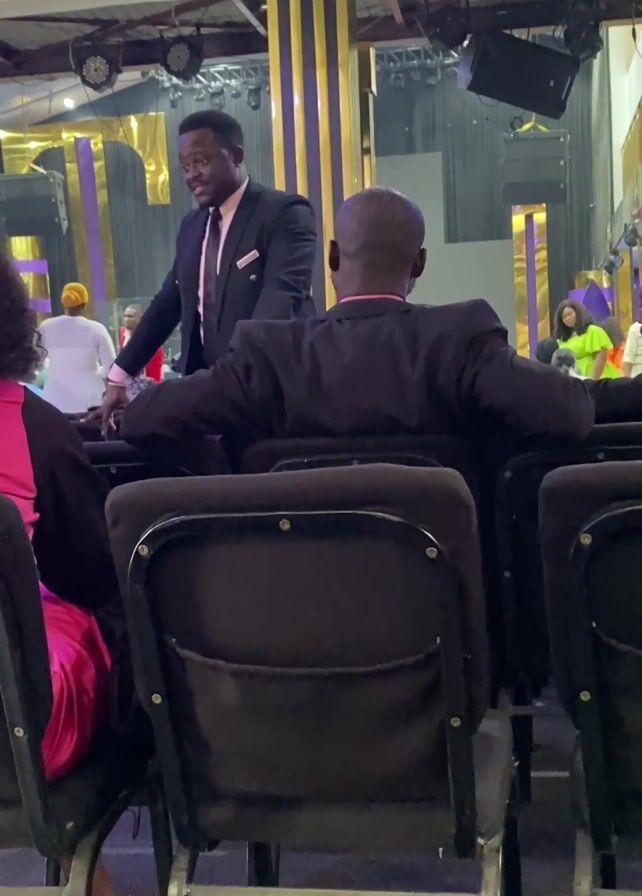 man in a suit standing in a room that resembles a church or auditorium, addressing another man seated in a chair. The speaker is leaning on the back of the chair while talking. Other people are also sitting in the chairs. The room features a stage with gold and purple decorations. Stage lighting is visible.