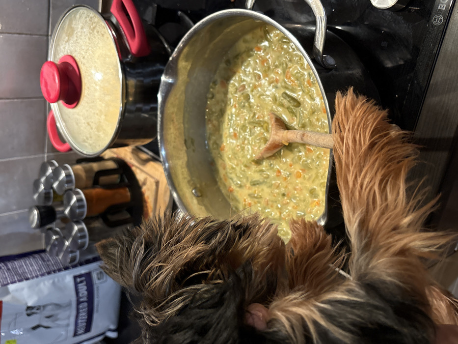 The image displays an indoor kitchen scene. In the foreground left, a small, long-haired dog, likely a Yorkshire Terrier, with brown and black fur, is partially visible, its head turned to observe a cooking pot. A stainless steel saucepan in the center, positioned on a black induction stovetop, contains a light green, creamy stew with visible pieces of green beans and carrots. A wooden spoon is resting within the stew. To the right and slightly behind, a second stainless steel pot with red silicone handles and a clear glass lid is visible, exhibiting condensation on its interior. In the background left, a white bag of pet food labeled "NEUTERED ADULT" is present, next to a black rotating spice rack holding multiple glass spice jars with silver lids. The specific location within Sofia, Bulgaria, cannot be determined from the visual information provided in the image.