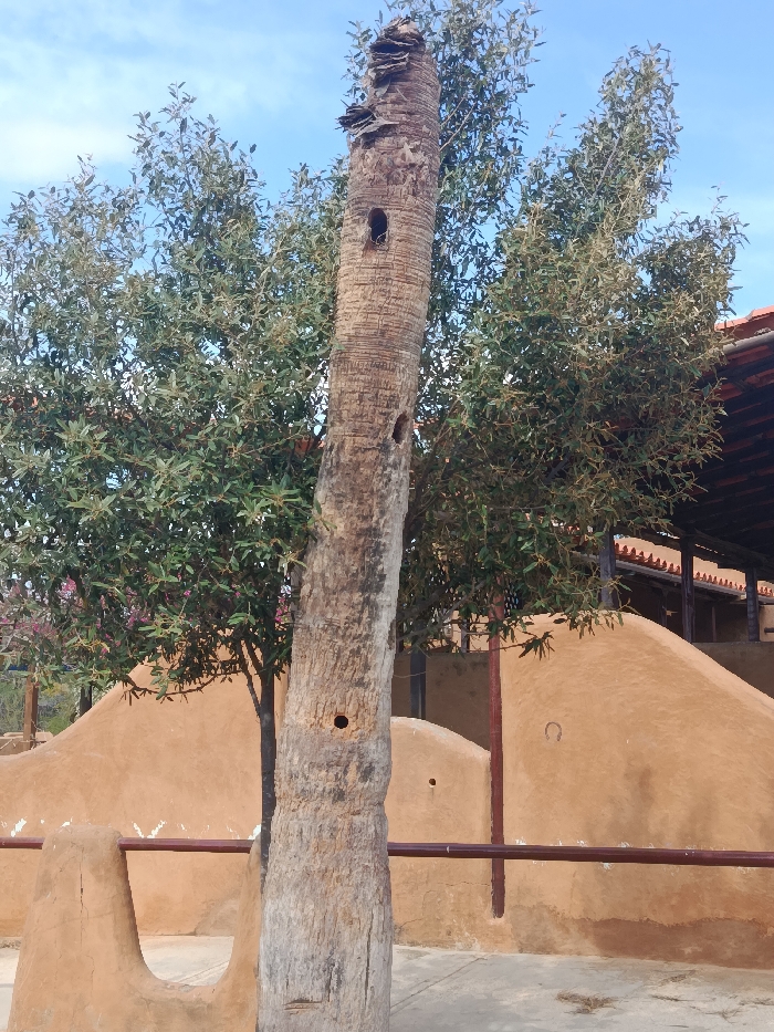 This image depicts an outdoor scene in Guayacancito, Venezuela, characterized by arid-style architecture and vegetation under a clear, bright sky. A tall, desaturated, greyish-brown palm tree trunk stands centrally, leaning slightly right. The trunk exhibits prominent horizontal striations and features two distinct circular holes: one in the upper-mid section and another lower down. The apex of the trunk displays dark, irregular, shelf-like formations, possibly fungi or decaying frond bases. Behind and flanking the palm trunk are two trees with dense green foliage; one to the left shows sparse pink blossoms. The background is dominated by light brown, organically shaped adobe-style structures. A prominent, upward-sloping wall features a dark horseshoe emblem. A horizontal dark reddish-brown bar or railing traverses the mid-ground, positioned between the palm trunk and the adobe walls. Further back, parts of a structure with a dark wooden frame and a reddish-brown tiled roof are visible. The ground in the foreground is a light-colored, possibly concrete or packed earth surface. No individuals or animals are present.