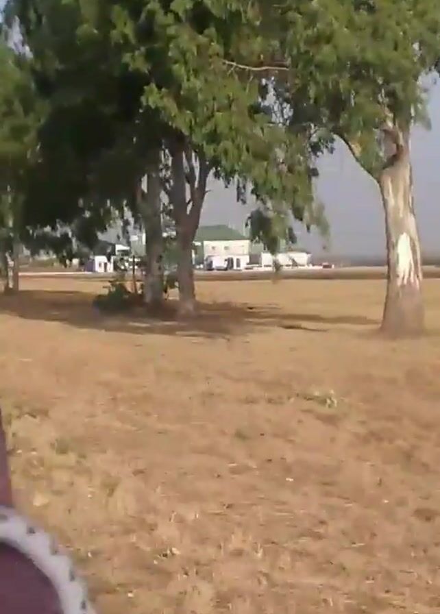 view from a moving vehicle of a dry, grassy field with several trees. In the distance, there is a white building with a tower, possibly an airport control tower. The camera is shaky, and the sound of wind is prominent. The foreground features part of the vehicle's interior, including a seat. The overall environment appears to be rural or suburban.