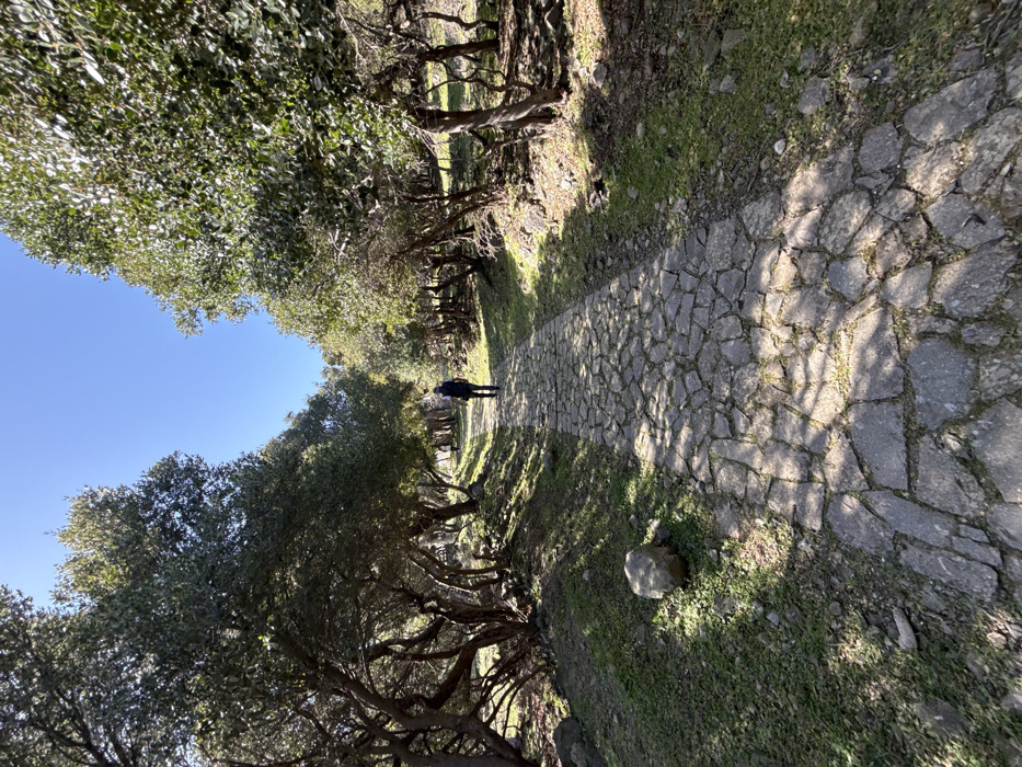 single individual walking on a stone-paved path through a tree-lined area in Kamariotissa, Greece