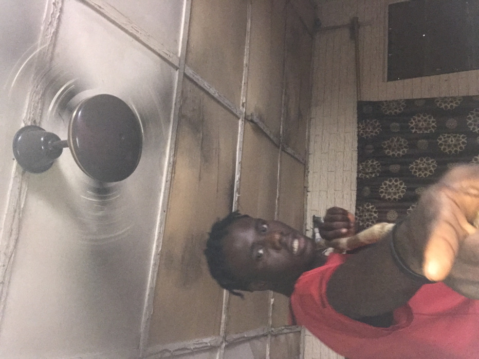 The scene is an interior room located in Narayi, Nigeria. A dark-skinned individual, appearing male, with braided hair and wearing a red t-shirt, is captured mid-action, facing directly towards the camera. His right arm is extended forward, hand open with fingers slightly curled, while his left arm is bent, forming a fist. He exhibits an intense facial expression, with wide eyes and bared teeth. Above and behind him, a dark-colored ceiling fan is actively rotating, its blades blurred by motion. The ceiling consists of light-colored panels with visible seams. In the background, a patterned curtain with circular motifs covers a portion of a wall, which has a light-colored, brick-like texture. A dark rectangular opening, possibly a window or doorway, is visible to the far right.