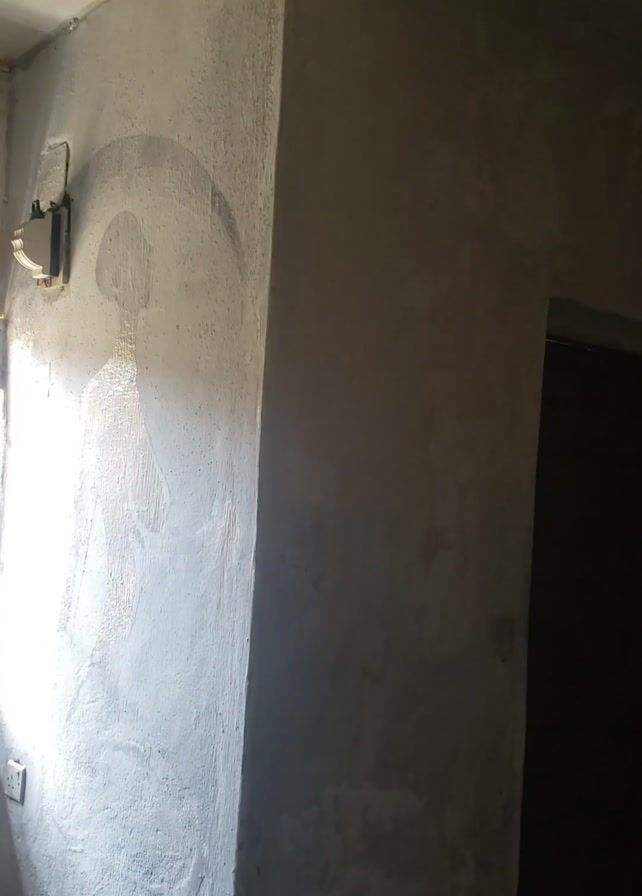 room with a concrete ceiling, a light fixture, and what appears to be a water stain. The camera then moves down to focus on a black and white painting of a lion on the floor. The painting is surrounded by a few items, including a plastic water bottle and a white plastic object.