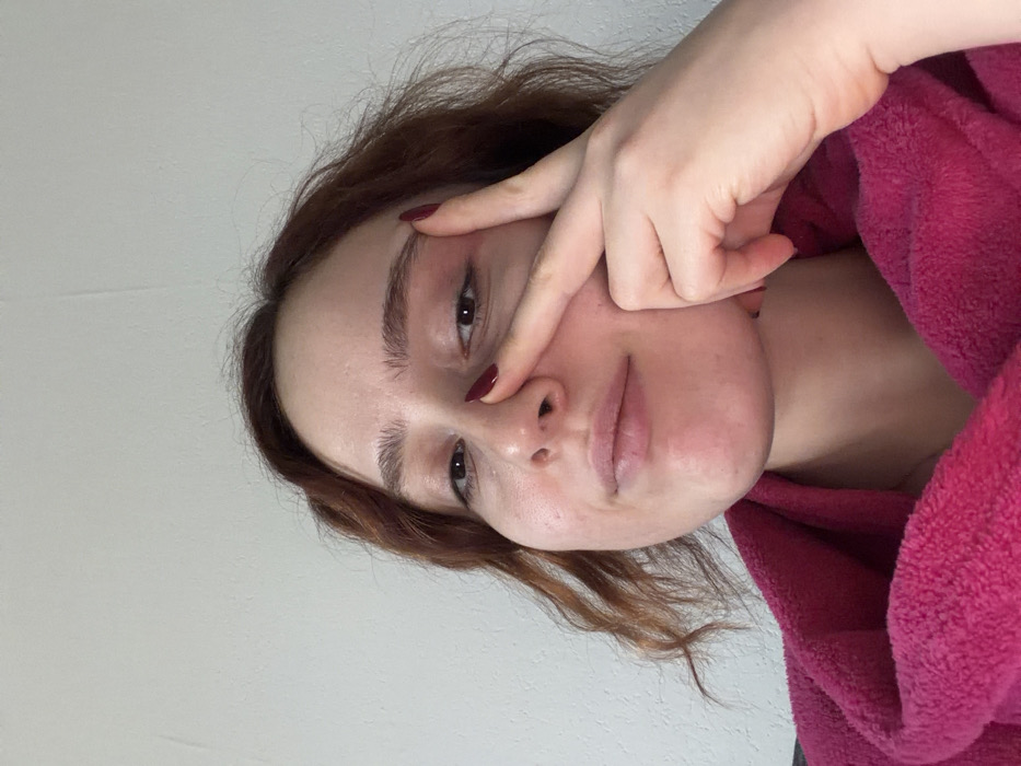 A young adult female is depicted in a close-up, frontal portrait, located in Reims, France. She has light brown, wavy hair and fair skin. Her attire is a bright pink, textured garment, consistent with a bathrobe. Her left hand is positioned with the index and middle fingers contacting the bridge of her nose and the medial canthus of her left eye. Fingernails on the visible fingers are painted dark red. A subtle smile is present. The background is an undecorated, light-colored wall. Illumination is consistent with ambient indoor lighting.