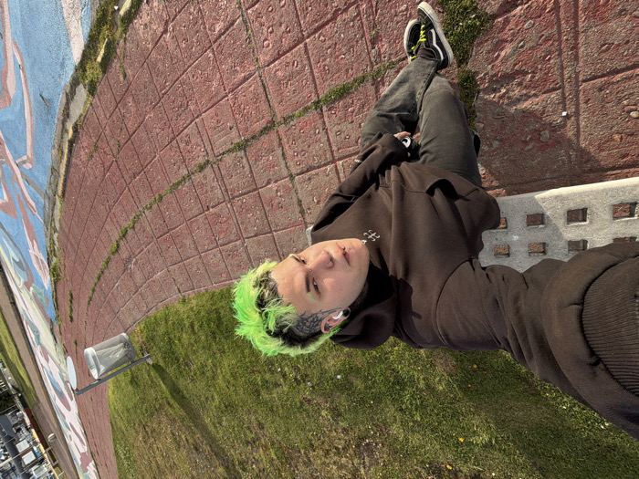 A single individual is depicted seated outdoors on a light grey concrete bench in Ushuaia, Argentina. The person has bright neon green hair, facial piercings (lip and nostril), and a prominent black tattoo on the left side of their face. They are wearing a dark brown hooded sweatshirt with a white logo on the chest, dark grey jeans, and black Vans-style sneakers with bright yellow shoelaces. Their legs are extended, with feet resting on a red tiled pathway. The individual is looking directly towards the camera, held by themselves in a selfie perspective. The immediate environment includes a wide, curving red tiled pathway, with moss growing in some grout lines. Adjacent to the pathway is a vibrant green grassy area containing a metallic street light with a clear, cylindrical top. To the left, a low wall features a colorful mural with light blue and reddish-orange figures. Distant urban structures are visible in the far left background. The scene is illuminated by strong natural sunlight.