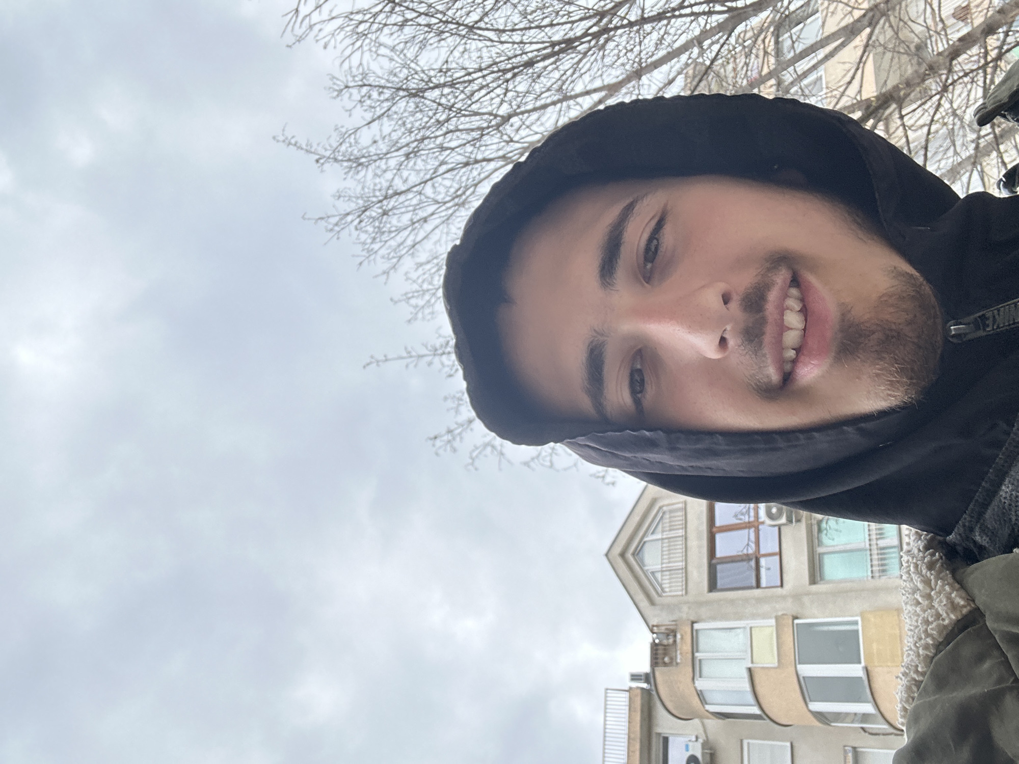 A selfie taken outdoors under an overcast sky shows a young man with brown hair, a beard, and a hooded jacket, smiling at the camera