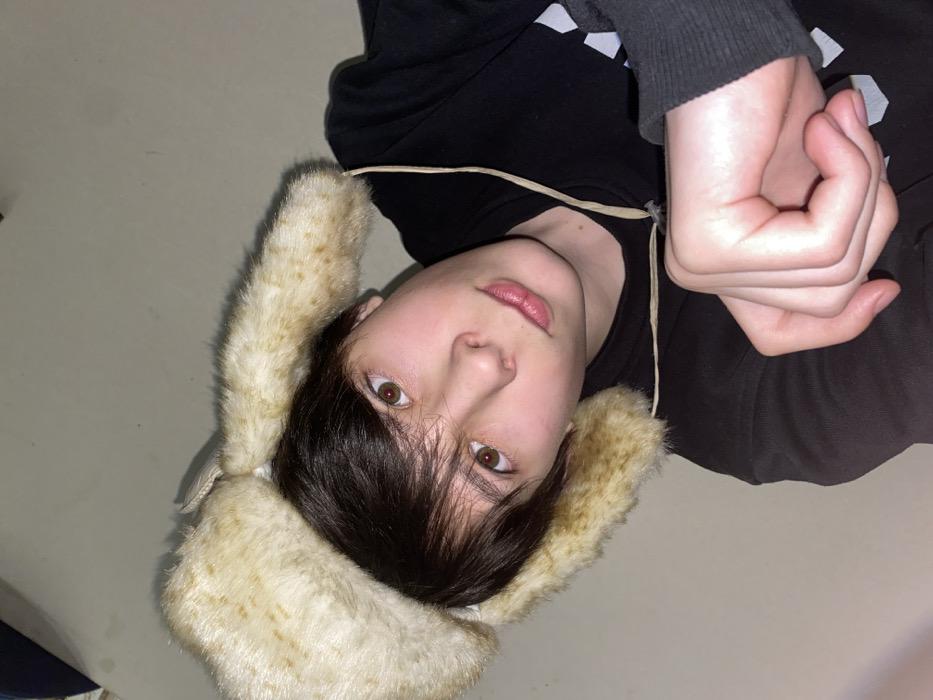A person with fair skin, dark hair, and brown eyes looks at the camera, wearing a fur hat with ear flaps. The person wears a black sweatshirt with white designs. Their hands are clasped. They are positioned sideways, on what appears to be a light-colored floor.