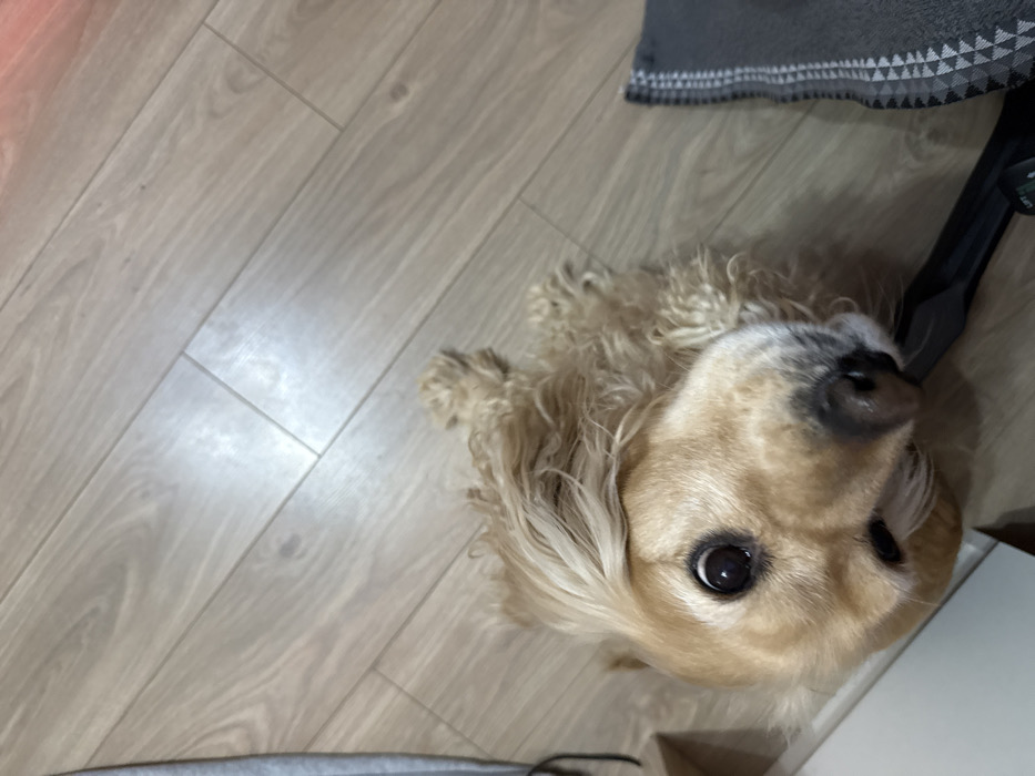 - "The scene depicts a golden-colored dog, consistent with a Cocker Spaniel breed, lying on a light-toned wooden plank floor" by FM-kSRys1, licensed under CC BY 4.0