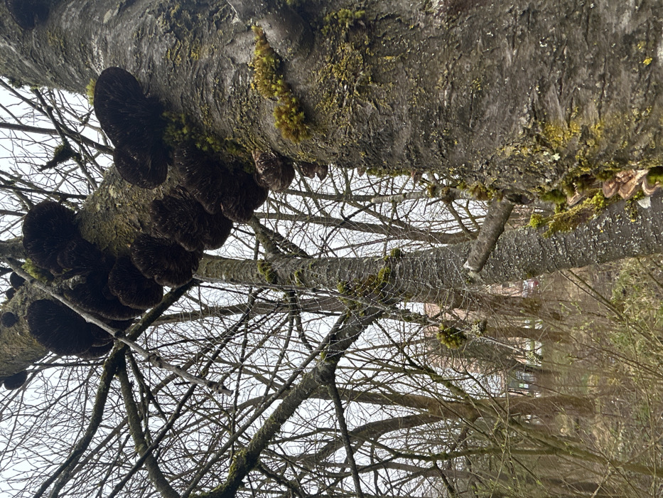 This image captures a wooded area within Ljubljana, Slovenia, presenting a close-up view of bare deciduous trees under an overcast sky. The foreground is dominated by a thick, dark grey-brown tree trunk on the right, heavily colonized by multiple clusters of dark reddish-brown, fan-shaped fungi (polypores) with a textured, layered surface. Patches of vibrant green and yellow-green moss and lichen are also visible on the bark of this trunk. To the left of the main trunk, a thinner tree trunk and branches are interwoven with a large, intricate spiderweb, visibly adorned with numerous small water droplets, indicative of dew or recent precipitation. The background consists of a dense arrangement of bare tree branches, through which faint outlines of light-colored buildings are discernible, suggesting the scene is located near an urban or semi-urban boundary within the city. No human figures are present.
