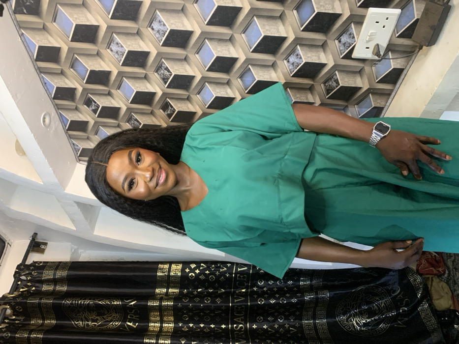 A woman with long, dark, wavy hair stands at an angle, smiling. She wears a green, short-sleeved top and a silver watch. Behind her, a patterned black and gold curtain with "VERSACE" is visible. The ceiling features a 3D cube design wallpaper, and a white electrical outlet is mounted on the wall. The overall lighting highlights her face and attire.