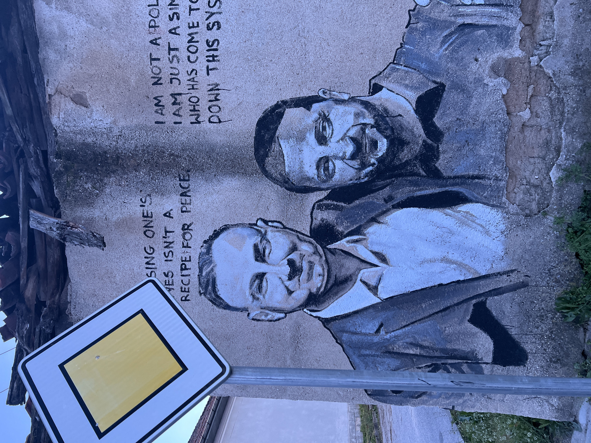 wall mural in Staro Zhelezare, Bulgaria. The mural features portraits of two men, rendered in grayscale. Accompanying the portraits are textual phrases written in black, including "SING ONE'S YES ISN'T A RECIPE FOR PEACE," and "I AM NOT A POL I AM JUST A SIN WHO HAS COME TO DOWN THIS SYS." In the foreground, a road sign with a yellow square is visible, partially obscuring the mural. The surrounding environment consists of vegetation near the base of the wall and a building with a tiled roof in the background. The mural is painted on a textured, aged wall surface.