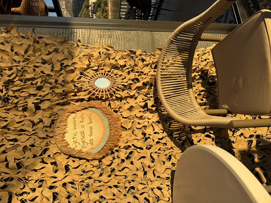 The image depicts an unoccupied outdoor seating area, presumably located in Kamenovo, Montenegro, under direct, warm sunlight. The primary background consists of a vertical surface covered with a tan, leaf-patterned camouflage netting or fabric, which casts sharp shadows from foreground objects. Two decorative items are affixed to this wall: a roughly circular, fringed textile hanging on the left featuring text in Montenegrin ("Ljeto, more, pijesak u kosi da smo bosi"), and a smaller, circular mirror with a sunburst-style wicker frame on the right, reflecting a bright sky. In the foreground, the edge of a light-colored, round table is visible on the left. To its right, an empty chair is positioned, featuring a light beige woven backrest and armrests, with a matching seat cushion. Beyond this immediate area, a calm body of water is visible, bordered by hills adorned with scattered buildings, under a clear sky. A dark vertical structural beam and a portion of a woven pendant light fixture are also discernible in the upper right segment of the image.