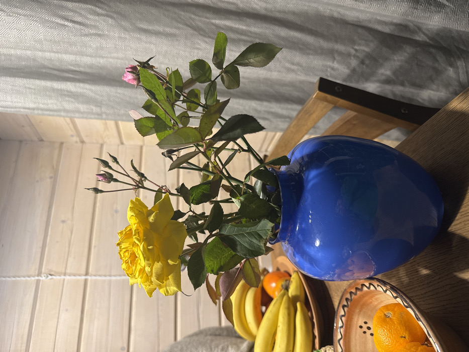 A blue vase holds roses, with a yellow rose in full bloom and several pink rosebuds. The vase rests on a wooden table next to a bowl of oranges and a bowl of bananas. The scene is illuminated by sunlight. A wooden chair leg is visible in the background, and a white curtain hangs in the top portion of the frame.