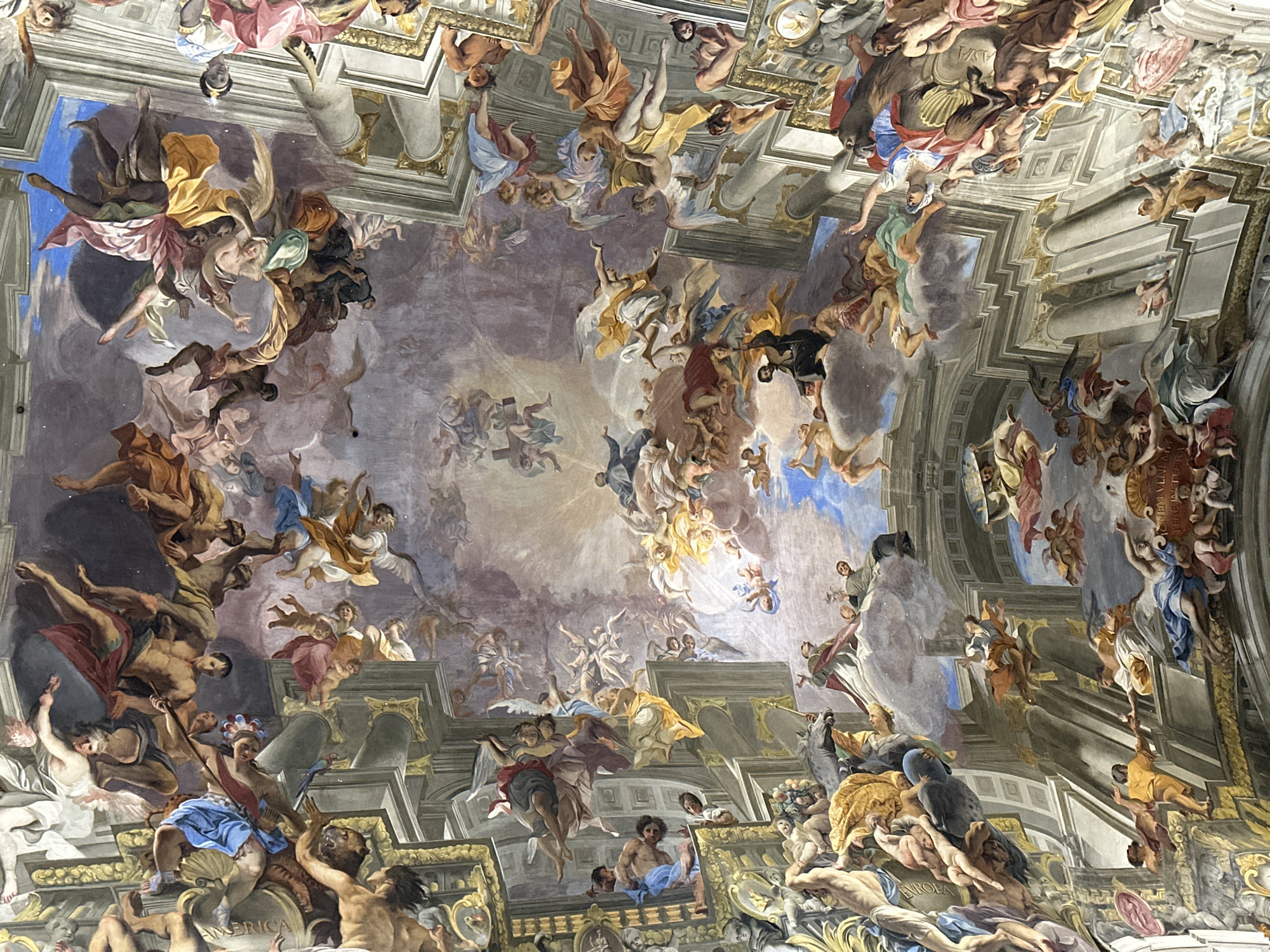 The image displays a monumental, illusionistic Baroque ceiling fresco located on the nave ceiling of the Church of Sant'Ignazio di Loyola a Campo Marzio in Rome, Italy. This elaborate artwork, known as the "Apotheosis of Saint Ignatius" by Andrea Pozzo, transforms the flat ceiling into an expansive, open sky. Hundreds of human and angelic figures, rendered in dynamic and often dramatic poses, populate the celestial scene. Many figures are partially nude or clad in brightly colored, flowing drapery, ascending or descending amidst soft clouds towards a central, brilliant light source. Faux architectural elements, including ornate columns, cornices, and arches with golden accents, are painted in a trompe l'oeil style, appearing to extend the physical structure of the church into the illusionistic heavens. Some figures in the lower registers are identifiable as allegories of the four continents, such as one bearing the label "AMERICA." The entire composition uses vibrant colors and masterful perspective to create a profound sense of depth and movement, depicting a grand religious triumph.