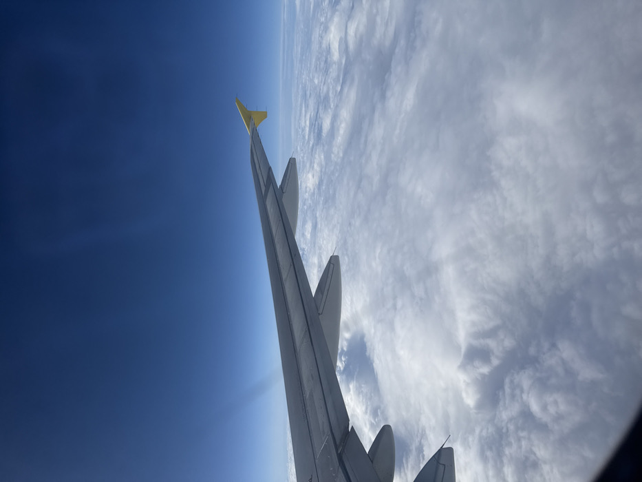 - "An aerial photograph, taken from inside an aircraft, depicts the right wing of an airplane extending into a clear, deep blue sky over a vast, dense expanse of white and gray clouds" by FM-IXb3V2, licensed under CC BY 4.0