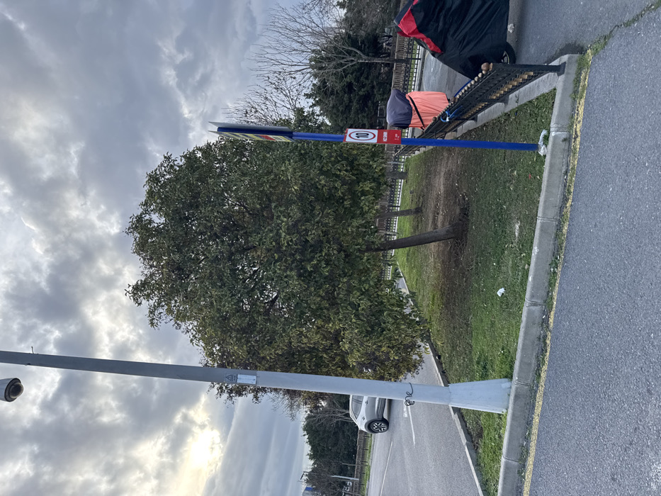 The scene depicts an outdoor urban environment in Zeytinburnu, Turkey, under an overcast sky with a brighter patch of light on the upper left horizon. In the foreground, asphalt pavement and a concrete curb delineate the edge of a road. A tall, light-grey utility pole, topped with a dome-shaped CCTV camera, stands on the left. Behind this pole, a silver compact SUV is visible on the road, facing right. A grassy median strip occupies the center, featuring a prominent deciduous tree with dense green foliage and another bare-branched tree further to the right. Sparse ground litter is present on the grass. On the right, a blue pole supports a vertical sign board and a circular red and white "10 HIZ SINIRI" (10 speed limit) sign. An ornate black metal fence runs along the right side of the median. Behind this fence, two covered objects are visible: one with a peach/orange base and a grey top cover, and another, likely a two-wheeled vehicle, completely encased in a black tarp with a red stripe. The background consists of a dense line of trees, both evergreen and deciduous. No individuals are present in the visible area.