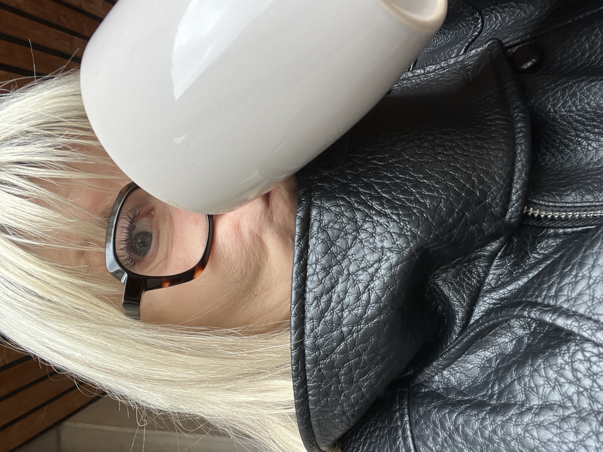 This image depicts a close-up, eye-level perspective of an individual drinking from a white mug in La Fouillouse, France. The subject is a person with light blonde hair, wearing tortoiseshell-framed glasses. Only their right eye and upper face are fully visible; the white ceramic mug obscures the lower portion of their face as they bring it to their mouth. The individual is wearing a black, textured jacket, possibly leather or faux leather, exhibiting a quilted or cross-hatched pattern. A silver zipper pull is visible on the jacket's front left side. The background is blurred, revealing vertical dark stripes, consistent with wooden paneling or a similar structure.