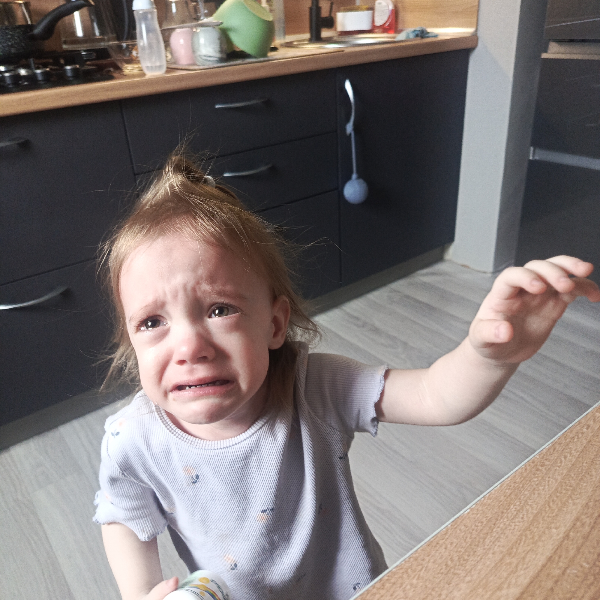 A young child is crying, tears are visible on their face