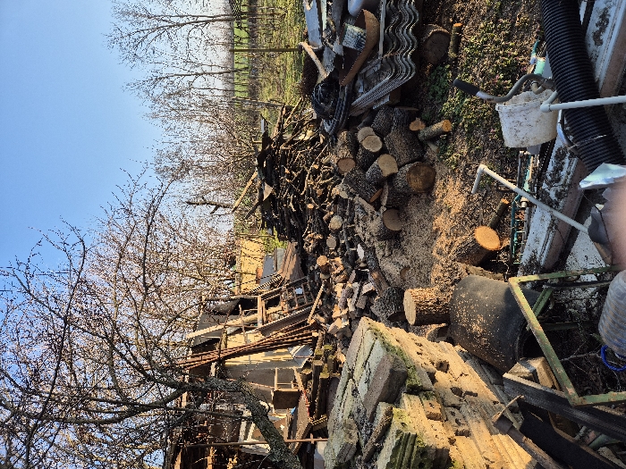 An outdoor scene in Iantra, Bulgaria, depicts a cluttered yard or garden area under a clear blue sky. To the left, a stack of weathered, light-colored bricks, some exhibiting green moss, is present. Behind these bricks stands a partially dismantled or derelict structure, characterized by exposed wooden beams and miscellaneous building materials. The central area features a large accumulation of cut wooden logs and branches of varying sizes, interspersed with a significant amount of sawdust, indicating recent woodcutting activity. Further back, a dark pile of charred debris or wood is visible. The ground consists of dirt with sparse patches of green vegetation. In the foreground, various discarded items are scattered, including a black barrel, a green metal frame, a white bucket, a spade handle, and a black corrugated pipe. Bare deciduous trees with budding branches frame the left and mid-background. In the far background right, a green field extends towards a distant treeline under the horizon. No individuals are present.