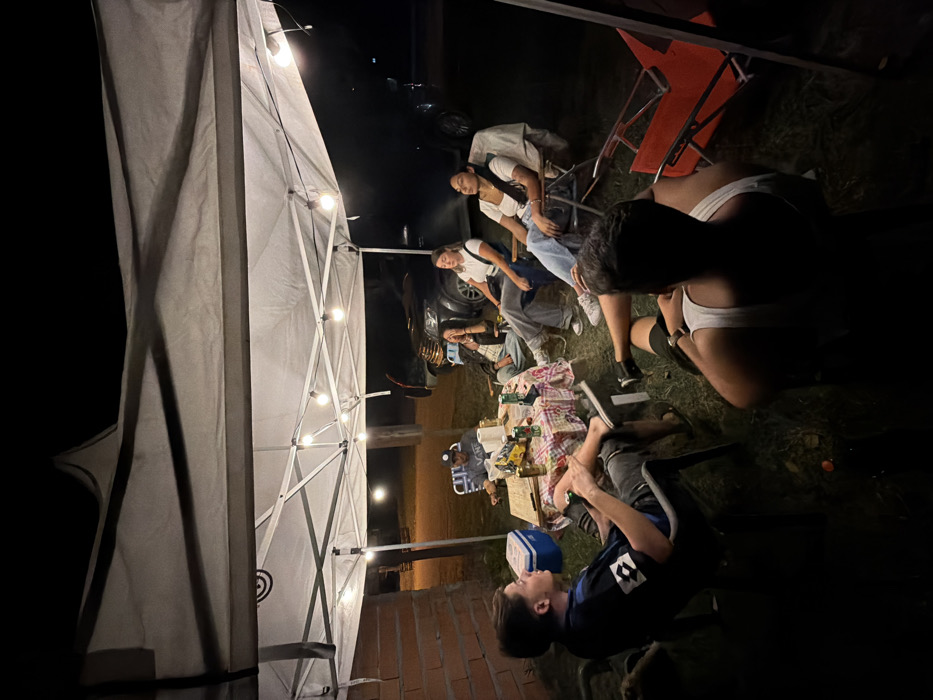 A nighttime gathering under a white tent illuminated by string lights. Around a low table covered with a patterned cloth, people are seated in chairs. There is a cooler and various containers on the table. A car is partially visible in the background. The scene appears to be in a yard, with grass and a brick wall visible in the foreground.